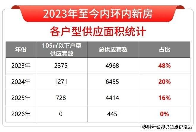 据小胖君统计,内环内105㎡以下的新房户型在2023年占比还接近一半,此后中小套型规则放开,占比骤降,2025年只有16%,2026年至今占比为0,几近绝版!