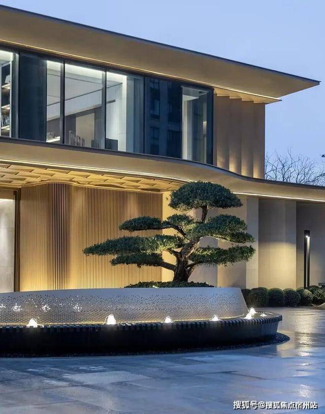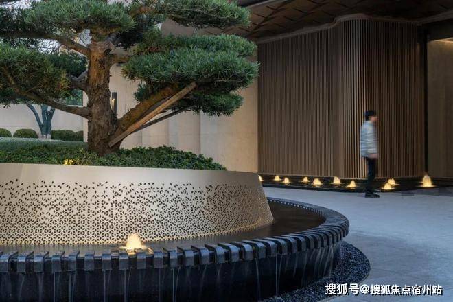 入口地面,犹如一幅延地面展开的画卷,标志性的椭圆迎宾水景坐落于整幅画卷中央,为其添了一抹生动。水景在形态流畅、定制级穿孔板的映衬下更显尊贵非凡,精选造型松搭配椭圆水景相得益彰,共同营造出一种令人新矿神怡的自然氛围,步入其中,便不由自主的引人向前探索更多美好。
