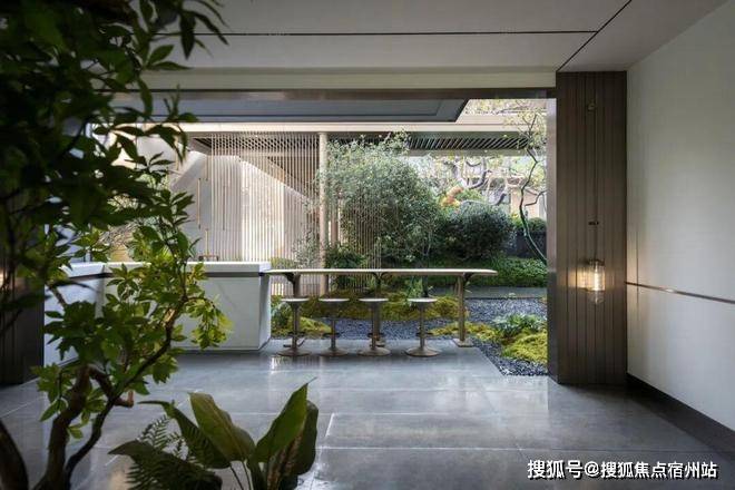 草坪东边融入下沉式卡座设计,与草坪旁的廊架遥相呼应,形成视觉上的和谐对话。下沉式卡座被一圈镜面水池环绕,水池底采用中国黑光面石材,简约灵动。
