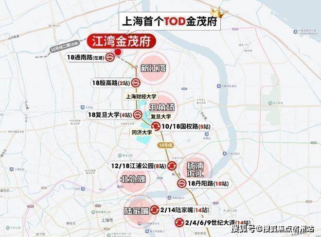 从18号线通南路站(在建,预计年底通车)出发,1站就是新江湾,3站财大,4站复旦,5站五角场,7站新华医院,10站杨浦滨江,11站陆家嘴滨江...