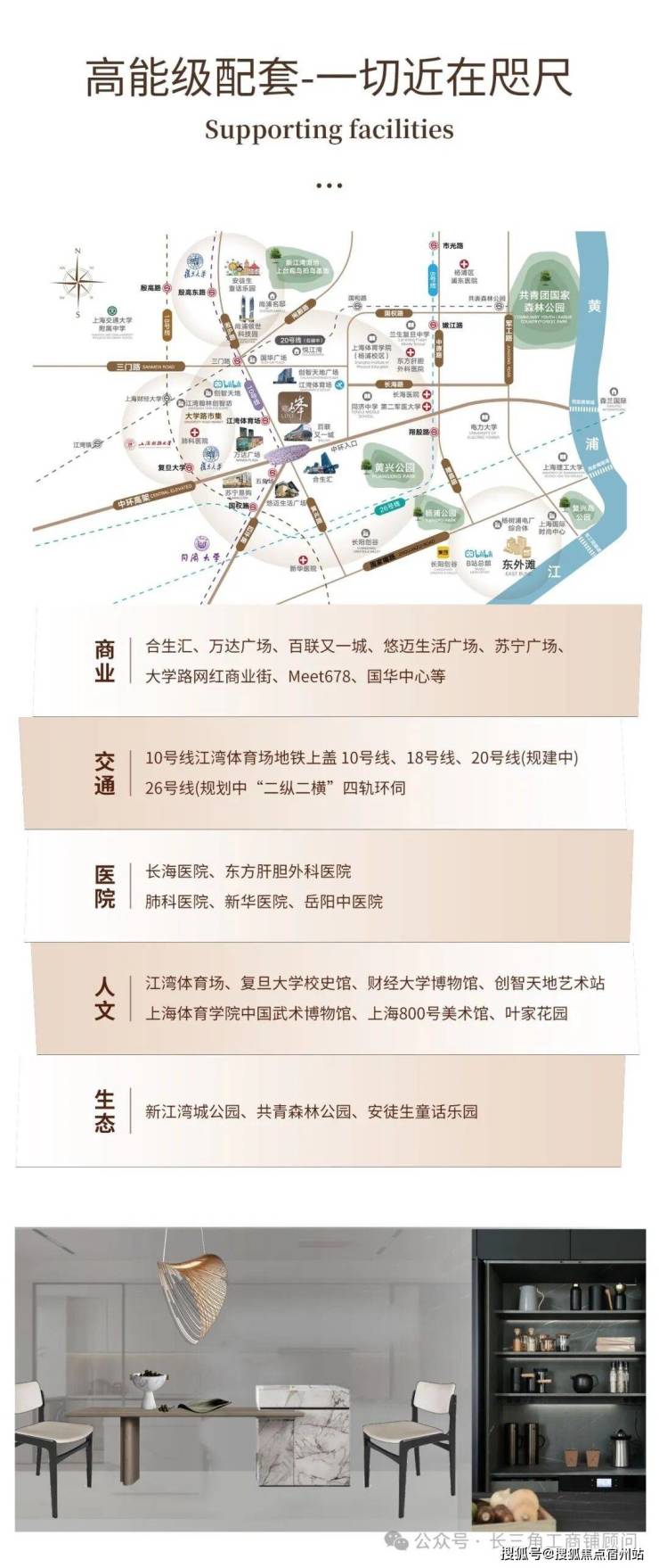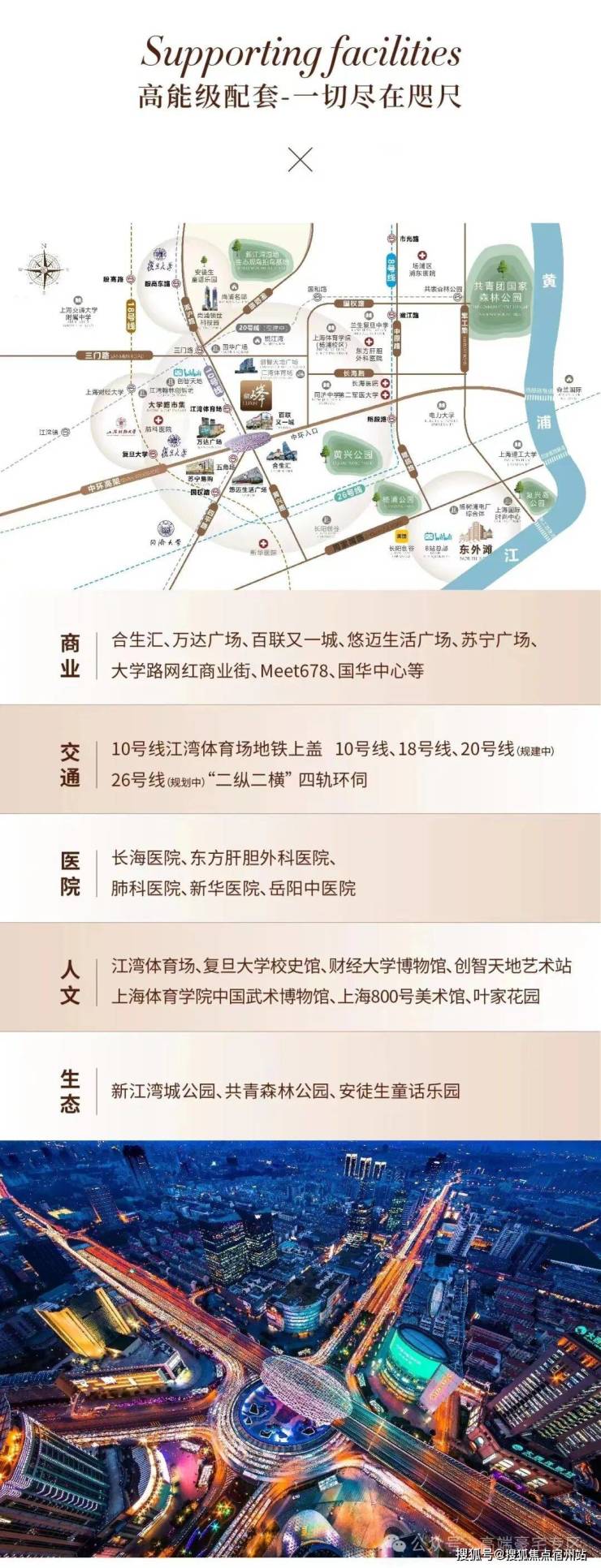 🛍️商业配套:合生汇、万达广场、百联又一城、悠迈生活广场、苏宁广场、🚇交通配套:10号线江湾体育场🏥医院:长海医院、东方肝胆外科医院肺科医院、新华医院、岳阳中医院