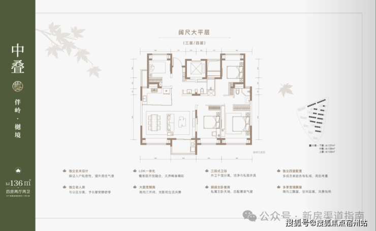 建面约137㎡下叠,四房两厅三卫全能格局,非常适合二娃家庭以及三代同堂。