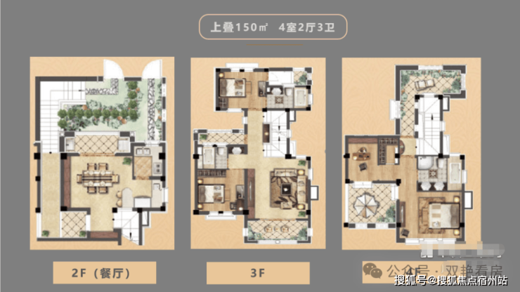 上叠户型是建筑面积150平米的三层,4房2厅中西双厨的全套房设计,特设独立花园入户通道,保障业主私密性。