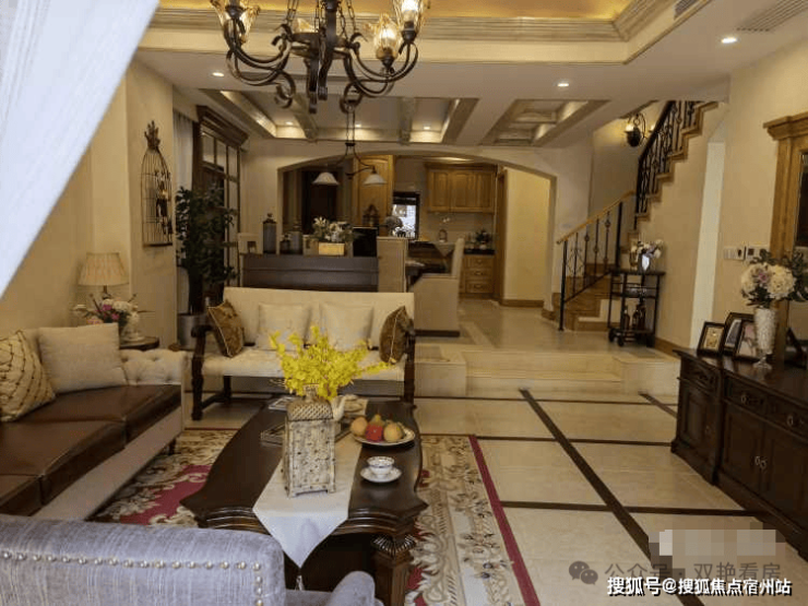 外立面采用文化石和手工打磨的stucco艺术涂料,烟囱、山花、铁艺栏杆、木质葡萄架,配合高低错落的彩瓦屋顶,空间层次优美。