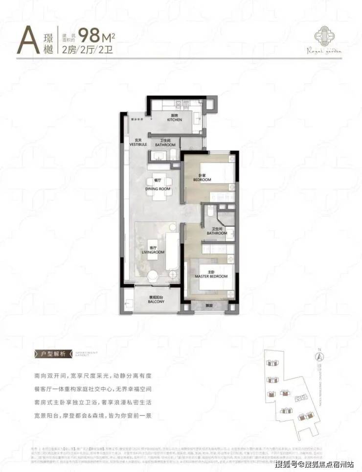 104㎡3户型特点: 该户型多为楼栋的 东边套,是一个观景户型。客厅连接270°阳台,视野出众。双卧朝南, 阳光满溢。从次卫布局看,如果家庭人口较少,该户型还能做成双套卧。