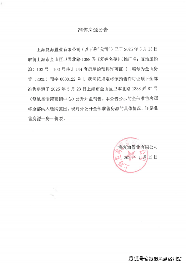 本项目的推广名为"复地星愉湾",备案名为"复锦名苑",开发公司为"上海复海置业有限公司"。预售证号:金山房管(2025)预字0000122号。