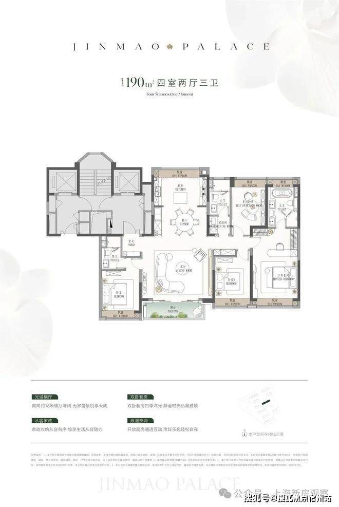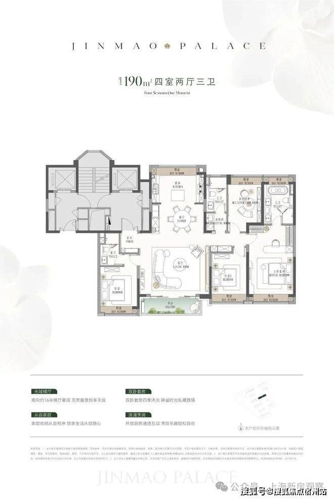 产品方面,预计将推出建面约110-190㎡3至4房产品,✅江湾金茂府售楼处电话:400-1183-708四种户型的飘窗与阳台空间都比较大。110㎡户型的阳台将次卧和客厅联通;✅江湾金茂府售楼处电话:400-1183-708123㎡是横厅设计;140㎡足足有七个飘窗空间;185㎡各个房间的空间更上一层。