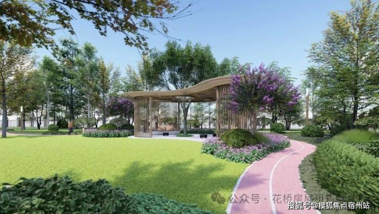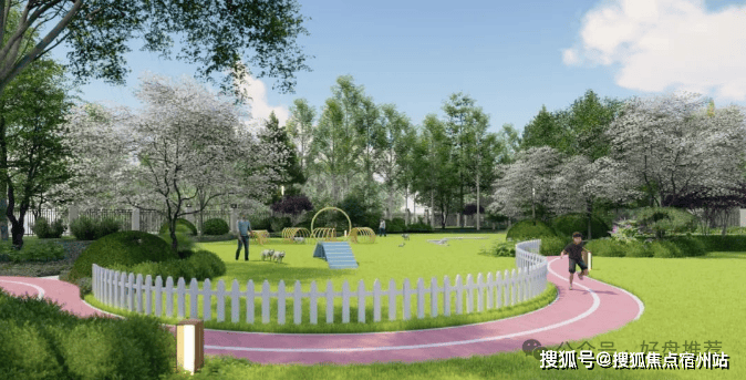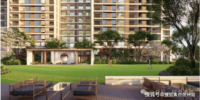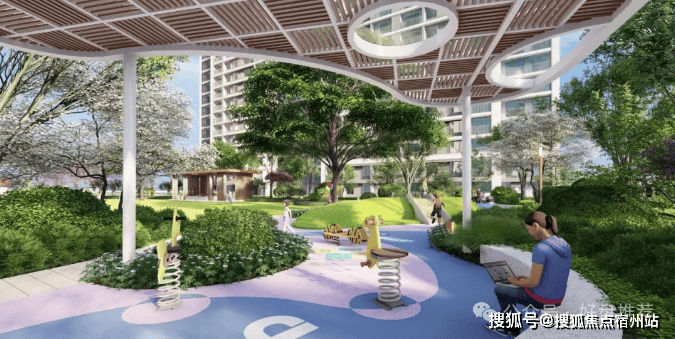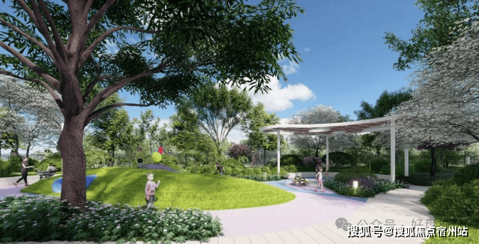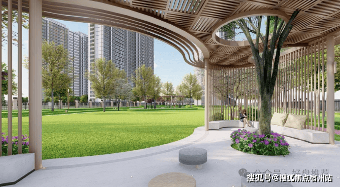 (项目景观效果图)【项目景观】以自然会客厅为核心主景,融入艺术廊架、阳光大草坪、泛会所架空层、健康跑道、儿童乐园等功能场地,构建风景中的社交场情景阳光草坪: