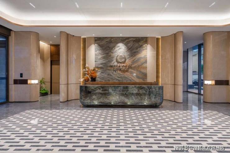 酒店式社区入口,设环岛落客区,高定入户大堂, 设飘顶弧形雨棚,顶部采用香槟金色的斜角造型铝板,搭配手工打磨的星空顶及氛围灯,地面铺设仿石砖,墙面基调则借鉴了 华尔道夫酒店的浅米黄色系大理石, 并配以精致的礼仪灯设计。