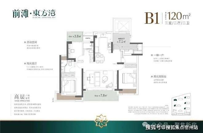 建面约120㎡3房2厅2卫,做到了3开间朝南+双阳台+主卧套房设计+270°转角飘窗,居住体验、舒适度、尺度感倍增。滩·東方湾售楼处电话:400-833-6309✅︎✅︎✅