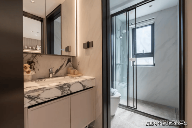 一些细节设计更显用心:卫生间镜柜带有内置插座、吹风机架以及主卫的美妆冰箱;三段式移门有效放大了淋浴间的进出空间。