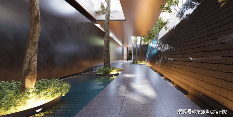 中灰色石材的厚重感,深灰色铝板的舒展度,“安缦金”高奢质感勾勒边框,与蓝眼睛光面石砖、冰花蓝光面石材的交织下,呈现出“天光云影”的意境。