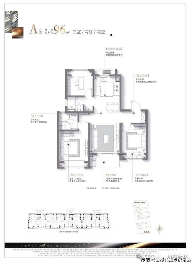 如建面约96㎡户型,性价比极高,是一个低总价上车3房的优质选择。经典飞机户型+三房两厅两卫设计,照顾家人的起居隐私;更有客餐厨一体化贯通设计,使得空间不设限更显大;主卧“小家化”,悦享静谧自由生活;进门处设置独立玄关空间,增加收纳的同时,也保护了业主隐私。