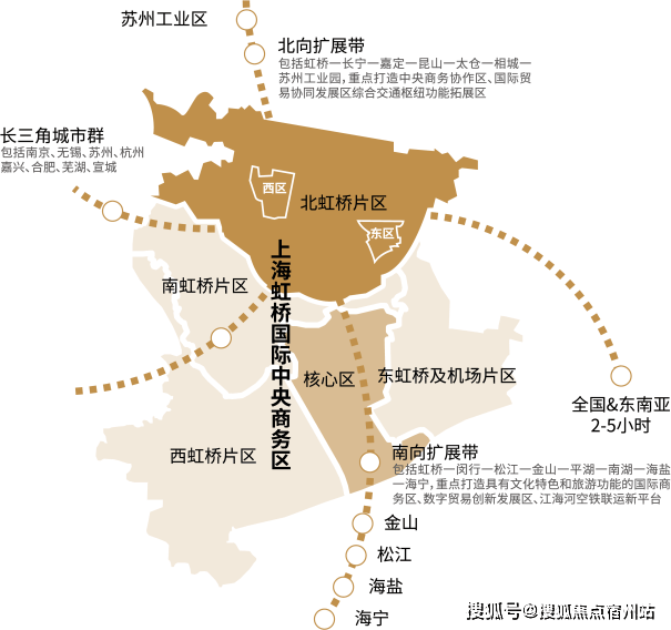 上虹桥依托东西两个片区(西居东产,共计约167公顷),整体打造创新经济集聚区、中央商务配套区和高品质国际化社区。