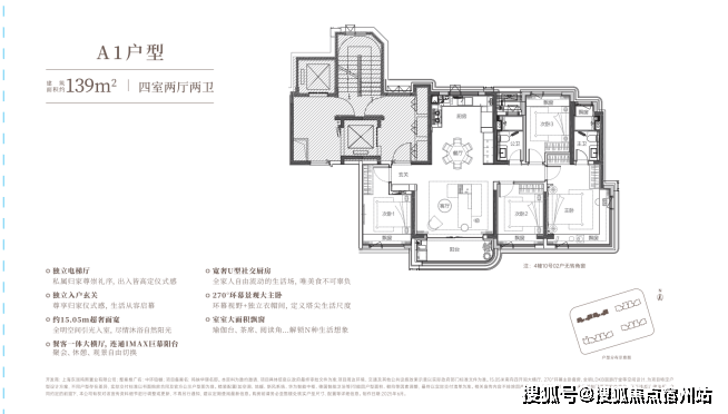 建面约139㎡4房户型,套数不多,但产品力绝对惊艳。四开间朝南,约15.05米宽的南向横厅、约1.6米进深的奢阔阳台,中环顶级享受的既视感。主卧约4.45米的进深,约4米大面宽(含飘窗),配合270°转角飘窗,是目前市面上产品力高配的户型之一,值得一冲!