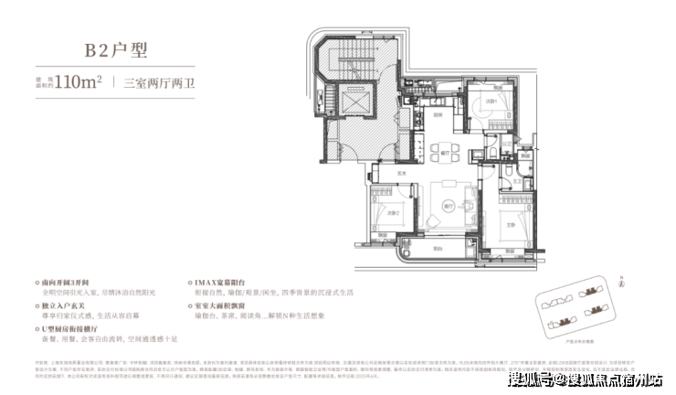 建面约110㎡边套(B1户型),1个宽面阳台、5个飘窗,整体南向面宽做到了约12.3米,大横厅面宽约5.4米,带来超大空间体验和充足通风采光。更为难得的是,该户型标配了全屋飘窗,主卧更是拥有270°转角飘窗,拓宽室内景观视野的同时,增加了实际空间使用率,加上三玻两腔系统窗隔音,在欣赏窗外景色的同时,也不会被噪音打扰。建面约110㎡中间套(B2户型),也同样做到了南北通透,三开间朝南,洄游动线,布局合理,无论是空间尺度还是通风采光,与边套享受一样的品质感!