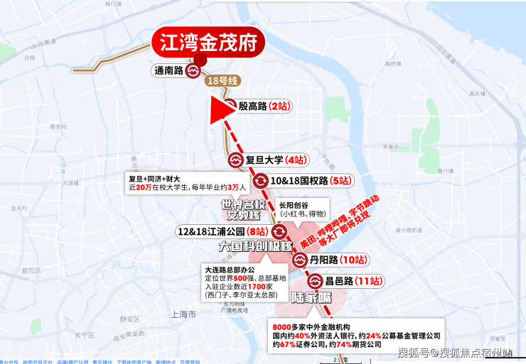 项目雄踞 上海市宝山区淞发路与长江南路交汇处,是 上海首座TOD模式金茂府、金茂府系3.0科技住宅的迭代之作、全球第78座金茂府。凭借其 占地约5.68万㎡、总建面约18.8万㎡、规划11栋12-17层小高层、876户、容积率仅2.2、绿化率32.75%、车位比1:1.42、物业费5.5元/㎡/月的硬核指标,以及 近享轨交、醇熟商业、优质教育与全龄社区配套的全能优势,江湾金茂府不仅是一处居所,更是对现代主城精致生活方式的一次深度回应。