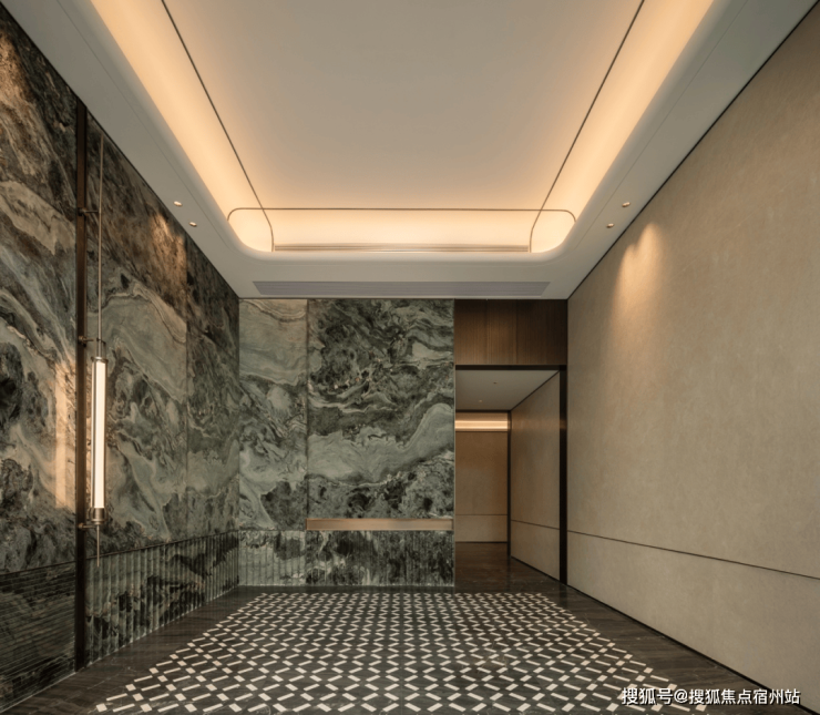 酒店式入户大堂的营造,精选雪山飞狐奢石,高山流水奢石、星白奢石等奢材。