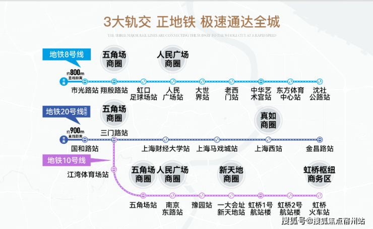 交通立体,三横二纵三轨交立体交通网。直线距离约800米就是8号线市光路站、还有20号线(规划)国和路站和10号线三门路站,串联起五角场、虹口足球场、静安、人民广场、新天地、淮海路等核心商圈。