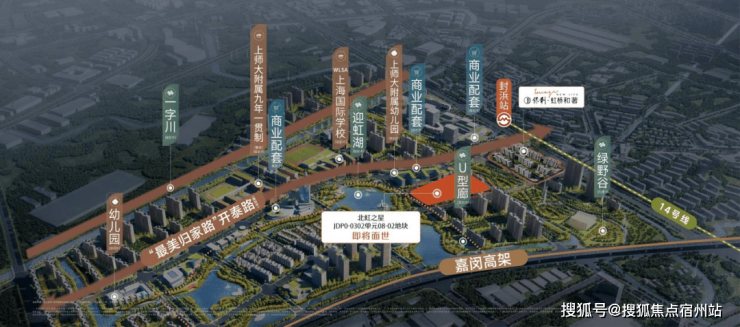 上师大九年一贯制学校完成立项批复 ,预计2027年开工、力争2028学年开启招生,上师大附属幼儿园(规划中)已签约,WLSA上海国际学校第三校区落址上虹桥,江桥大学城规划曝光; 200亩绿野谷 生态走廊一期实景呈现,二期加速建设,未来将串联迎虹湖(规划中)与一字川(规划中),构建媲美纽约中央公园的生态住区;直线距离约1.5公里 龙湖欢肆 已开业运营,直线距离约3.5公里江桥万达广场、南翔印象城MEGA环伺,板块内规划约1.4万方社区商业,东区规划约7.6万方万佛寺特色文化商业街区(规划中),满足高阶生活需求;华瑞时尚、聚升全球贸易中心、苏建研上海总部、厚朴堂中医总部 四大产业巨头 组团入驻东区,强力拉升区域产业能级,全面激活上虹桥板块发展动能。