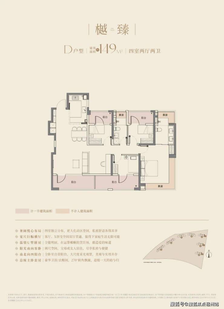 经典动静分离户型,4.5开间朝南+南北四阳台,阳合仅计算一半建筑面积,主卧以及主卫附赠270°转角飘窗;
