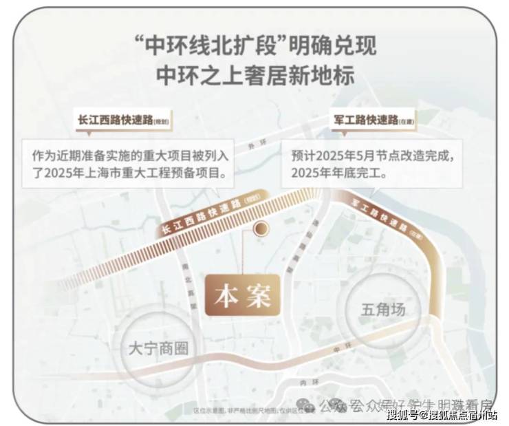 交通方面:项目紧邻长江西路地铁站(直线距离约150米),1站江杨南路,5站复旦,7站五角场。中环线北扩段明确兑现,军工路快速路25年开工,长江西路快速路列入上海市重大工程清单预备项目,快速链通城心,随着中环线北扩段的政策明确,淞南将正式进入中环时间。未来经逸仙高架,进入南北高架、内环高架、中环高架,可快速链通南北上海。