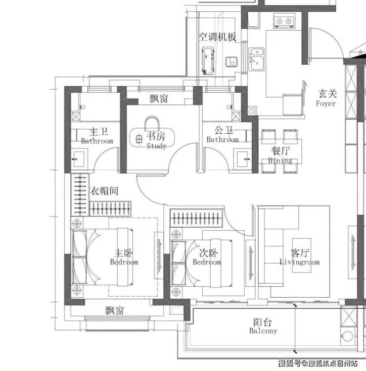 该户型做到了三开间朝南+超大面宽横厅+主卧套房设计+卫生间干湿分离+南北通透,功能性和尺度感完美结合。