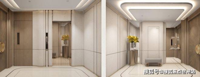 标准层电梯厅中,主厅地面均为石材,3D弧形墙面,吊顶曲线与地面呼应,以品质细节,进一步深化仪式感。
