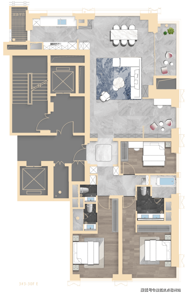 其中3#为超高层,北向可观小区绿化和苏河景观,高区可瞰三件套盛景。