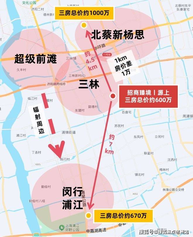 而招商臻境单价则依旧处于性价比十足的“6”字头,建筑面积约95㎡三房总价仅约600级,相比之下,北面直线距离约4.5km的北蔡新杨思,板块在售新房单价陆续超10万+/㎡,想买三房预算需破千万,每隔1km房价就几乎相差1万。