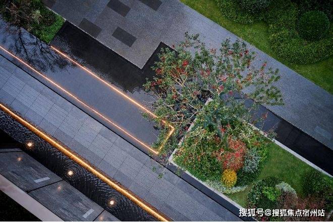 从空中俯瞰,跌水水景、亲水平台、色叶树阵等多重景观交融,展开一幅无与伦比的山水画卷。