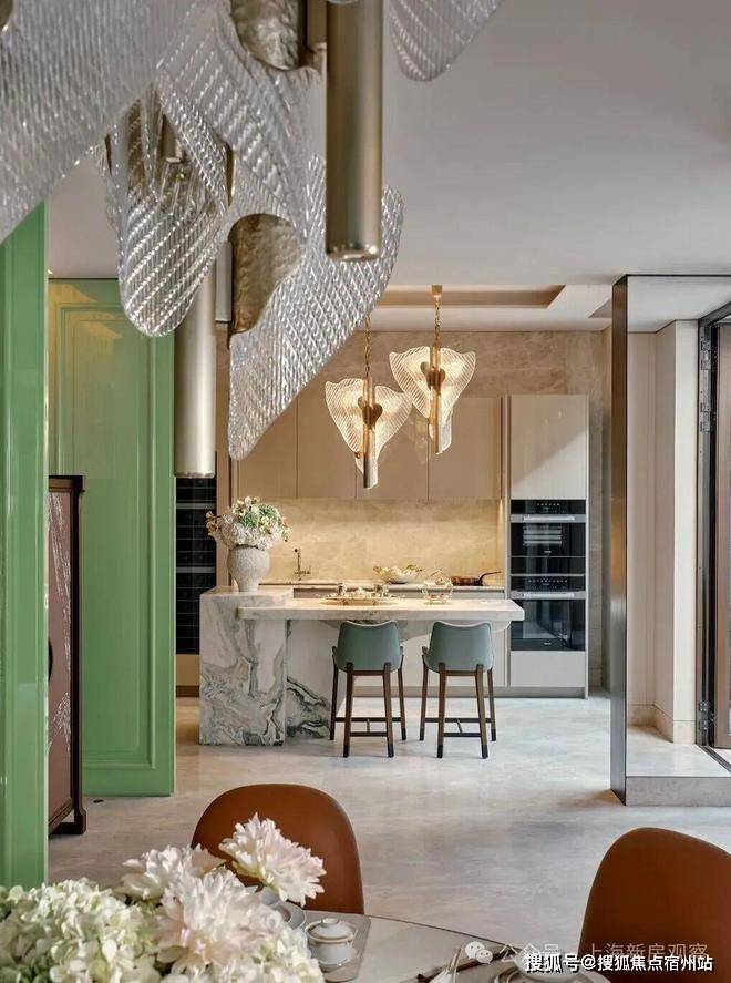 餐厅的设计巧妙融合了老上海的经典元素,圆形餐桌和橘色皮质餐椅在色彩上既现代又充满活力,顶部的水晶吊灯造型灵感来自上海市花“玉兰花”,既增添了空间的华丽感,又巧妙地融入了上海的地域特色。