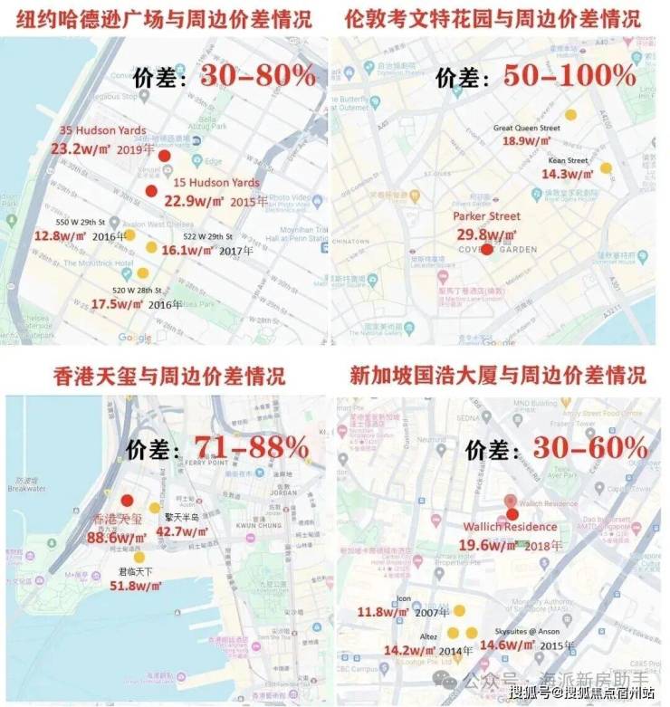 我们来看几个享誉全球的成功案例,纽约哈德逊广场,伦敦考文特花园,新加坡国浩大厦,香港天玺,这些顶级公寓都有一些共性点: