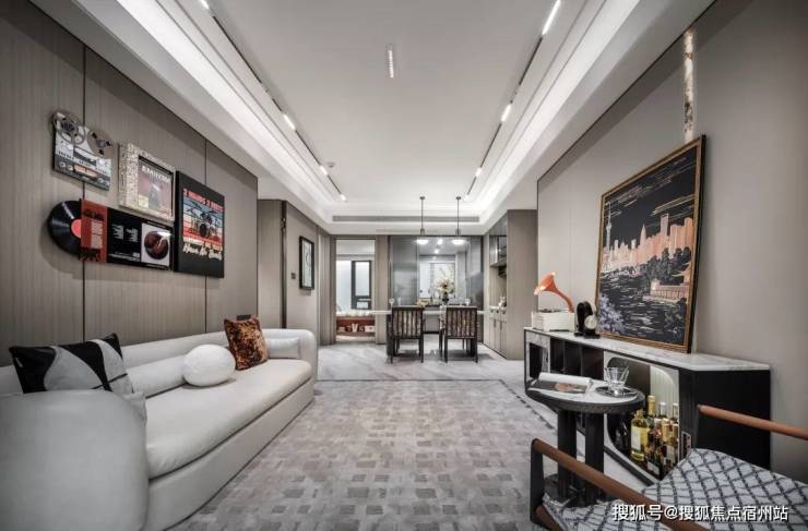 餐客厨一体化设计,进一步放大了空间感,层高约3m, 客厅的建筑面宽约3.4m, 整个餐客厅建筑面积约22㎡,包括 中央空调、地暖和新风 三大件都贴心配齐,餐厅区域的 餐边柜 也是交付标准。