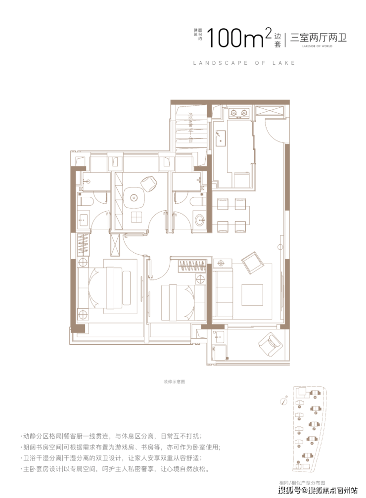 建面约100㎡3房2厅2卫,功能性和尺度感完美结合的3房户型。
