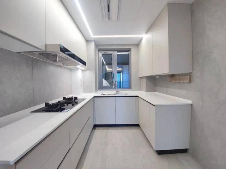 厨房U型操作台面,操作空间充裕;更值得点赞的是预留了双开门冰箱位置,你要知道普通百平米三房,基本只预留单体冰箱的空间。