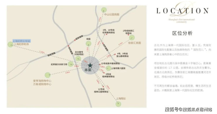 距离虹桥交通枢纽6.5公里左右,出差便利。产业、交通、配套齐聚,且周边就是古北壹号、古北臻园,圈层纯粹!