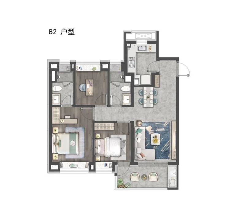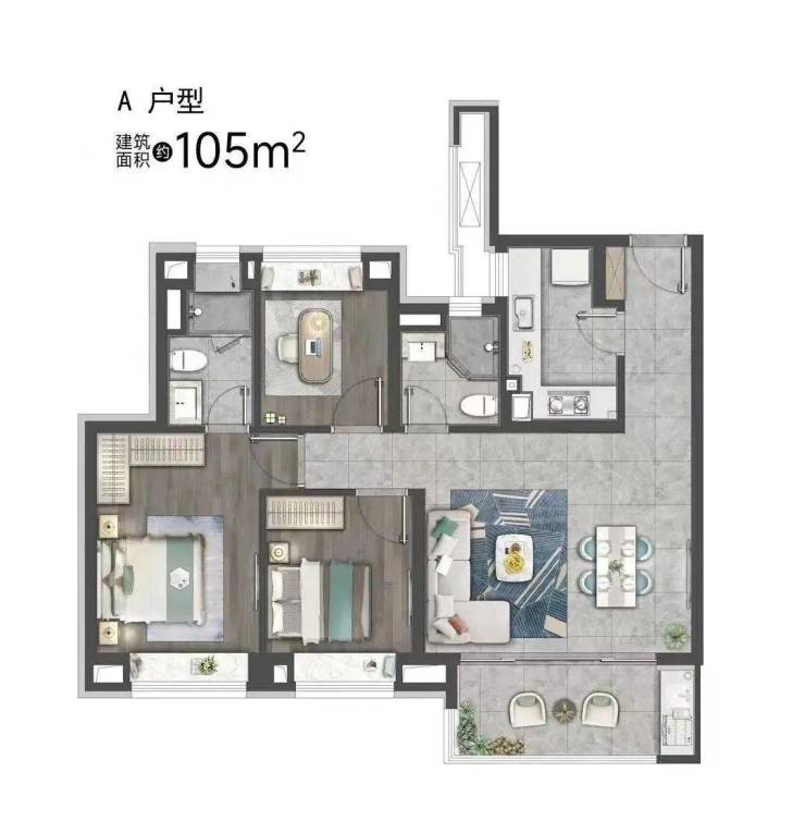 建面约105㎡为5.1米宽厅设计外接大阳台,这对黄金组合一方面撑开户内尺度,另一方面也让通风和采光俱佳。