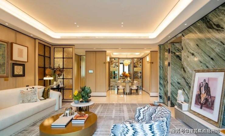 例如入户玄关铺设有“ 石材皇后”鱼肚印象 ,这种级别的奢石在很多顶豪项目中通常仅作局部镶嵌