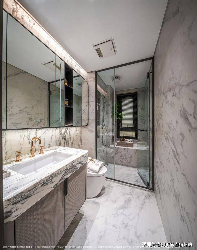 卫生间墙面采用大面积岩板,台盆柜处定制镀金龙头✅✅招商臻境售楼处电话:400 - 8824 - 258✅✅;另外超大镜面柜内配置了充电口,方便剃须刀、电动牙刷等工具收纳。