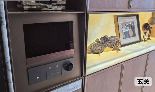 入户这座铸铝门,质感厚重;通顶玄关柜,内置消毒精灵,奢石把手+奢石台面更显海派温润气质,玄关地面都铺上了海上·清和玺的logo拼花,小小玄关做到了既实用又美观。