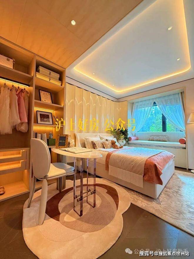 这可能是我见过弧形元素最多的样板间,吊顶、客厅墙面及卧室背景墙均采用大量曲面处理,涵盖木饰面与奢石等多种材质弧形工艺,即便工序复杂且成本高昂,但绿城仍坚持落实,只为业主更高级的使用体验