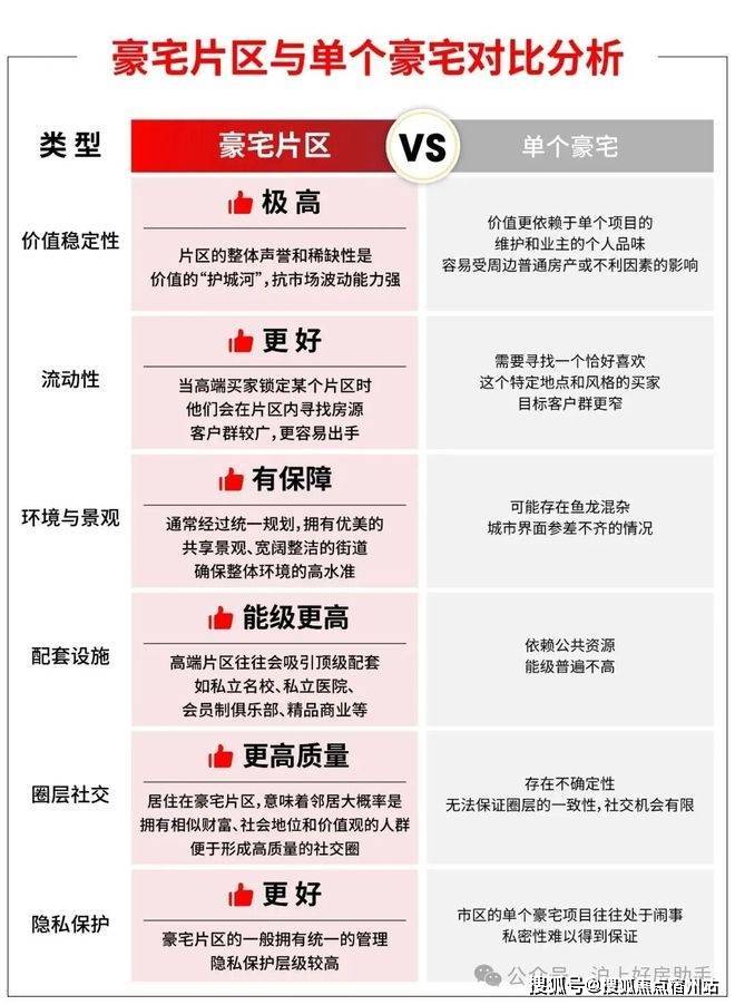 在价值稳定性、流动性、环境与景观、配套设施、圈层、隐私等维度,好房君做了两者的对比,供大家参考: