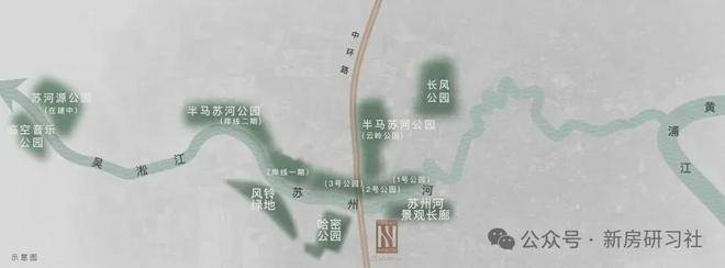 周边哈密公园、半马苏河公园岸线一期(在建中)及二期、苏州河景观长廊在侧,与梧桐成荫的街道相映成趣。
