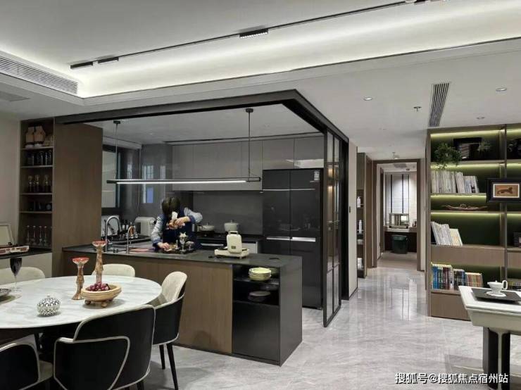 细节上,餐厅飘窗上的柜子是交付的;岛台靠餐客厅一侧也做了开放式的收纳,配了升降插座;