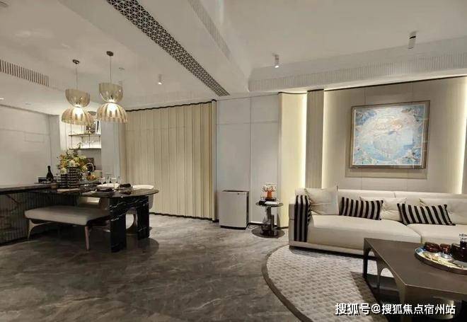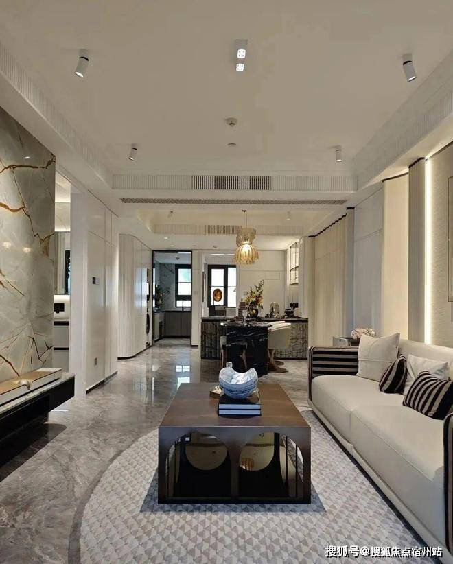 背景墙比别人更多一点。天然石材的电视背景墙,高级大气;编织皮革的客厅背景墙,充满质感;过度用的是白色木饰纹的背景墙,简约耐看;餐厅处又是白色皮革背景墙,大方优雅。整个空间过渡自然,增加了层次感和高级感。