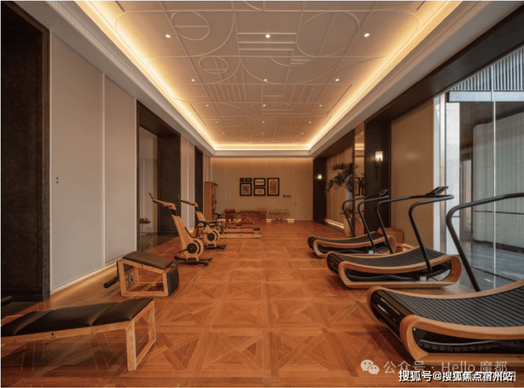 传承百年工艺手工打造拼花地板,隐匿式氛围光模拟塞纳河畔落日,器材选择上,为业主定制的沃特罗伦(WaterRower)品牌健身房, 全部采用珍贵的全木质健身器材,触感温润细腻
