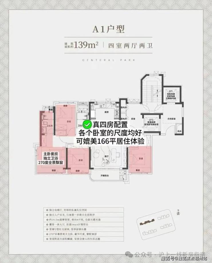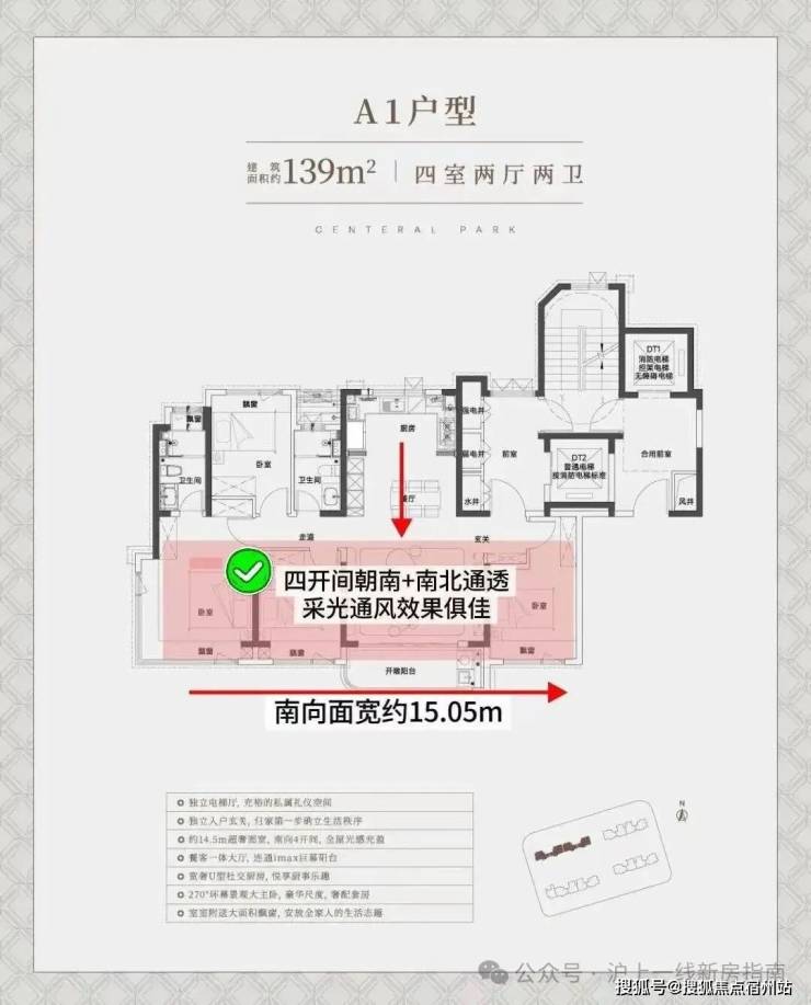 中环铂樾建面约139㎡的户型(西边套),独立电梯厅+罕见的大横厅设计,大面宽短进深,约15.05m的南向奢阔面宽,无论是采光感、尺度性都拉到了极致,享受城央豪宅级别的采光。