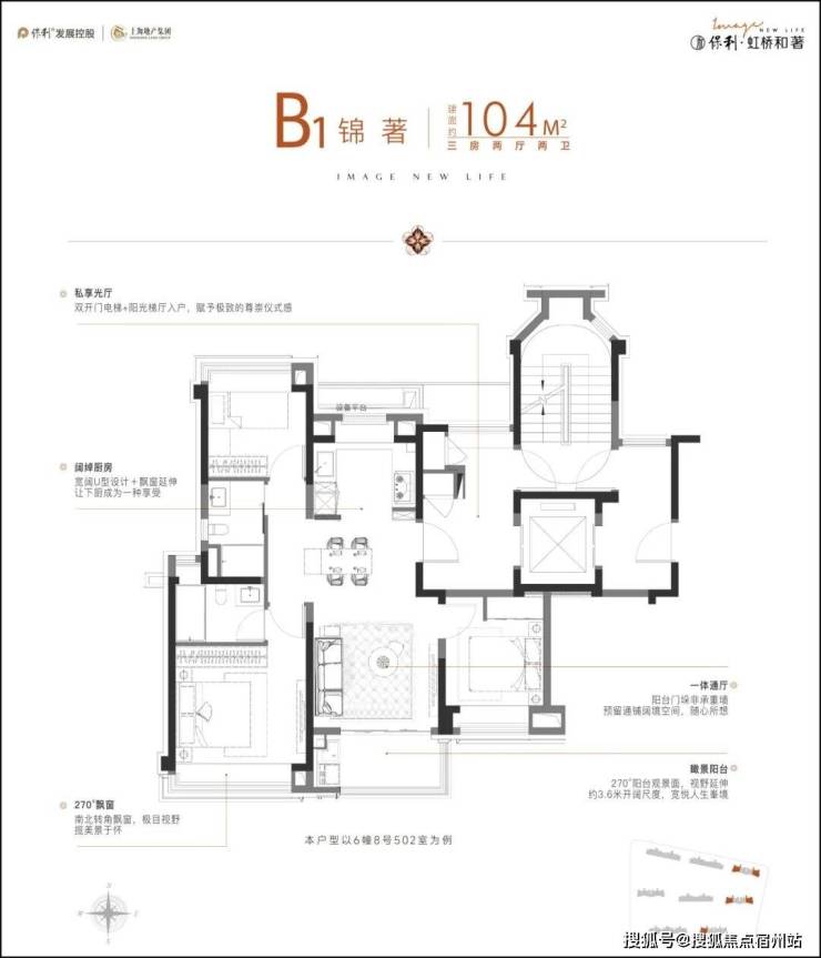 ☑️☑️保利虹桥和著售楼处电话:400-8377-020☑️☑️ 建面约104㎡舒适三房,三开间朝南+动静分区,设计水准颇高。特别是宽景阳台的设置,为客厅配备一幅iMax广角视野,多角度观赏社区美景,适配对品质有需求的首置或首改客户。