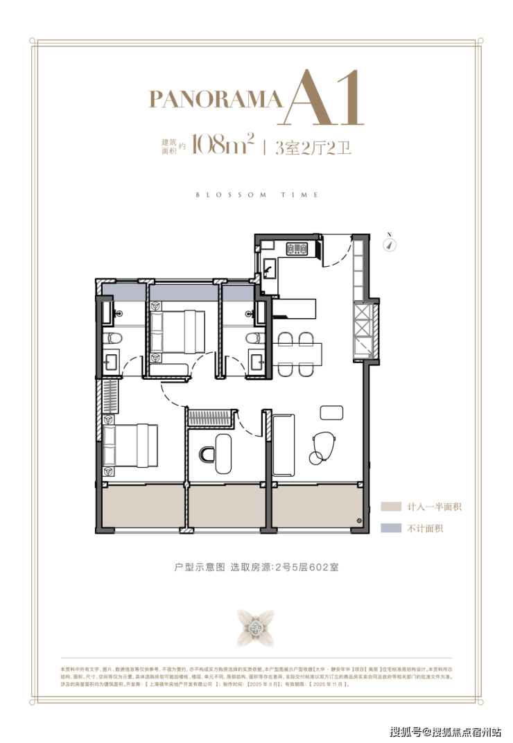 108㎡户型:名义单价12.65万/㎡,市场常规同面积段高层户型得房率按照78%计算,实得单价=12.65*78%/87%= 11.34万/㎡(数据模拟测算,仅供参考)